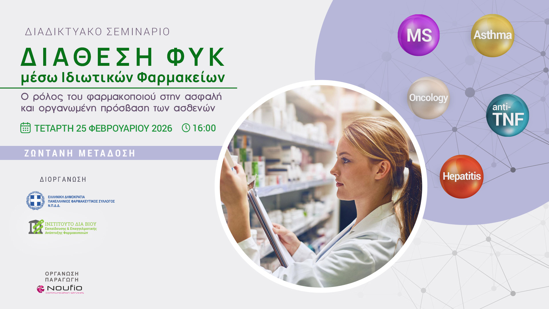 Ο Πανελλήνιος Φαρμακευτικός Σύλλογος (ΠΦΣ) και το Ινστιτούτο Δια Βίου Εκπαίδευσης & Επαγγελματικής Ανάπτυξης Φαρμακοποιών (ΙΔΕΕΑΦ) έχουν τη χαρά να σας προσκαλέσουν σε Διαδικτυακό Σεμινάριο με θέμα: